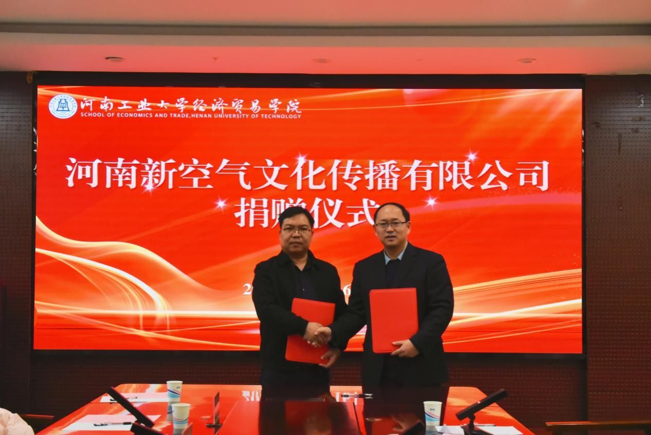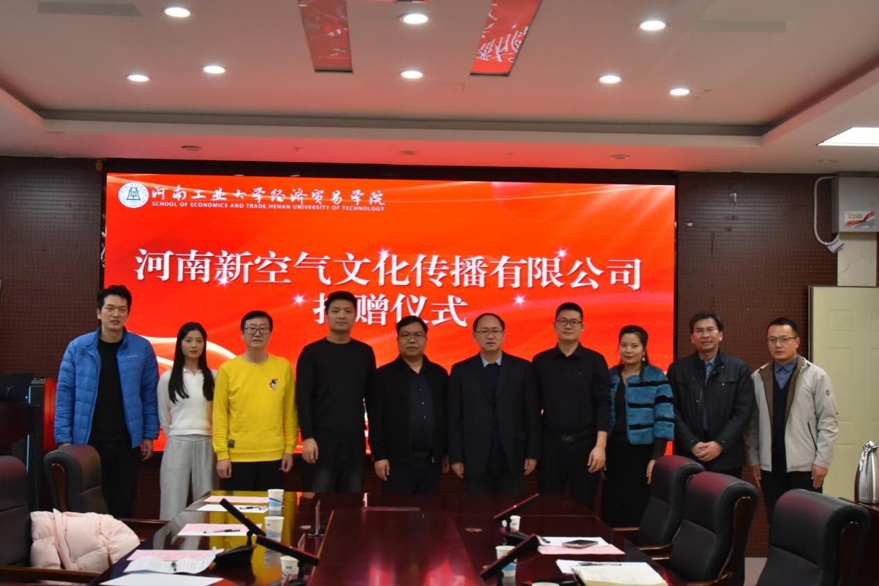 2025年12月16日下午,经济贸易学院与河南新空气文化传播有限公司于博识楼3501会议室举行捐赠仪式。河南新空气文化传播有限公司董事长李建科、策划总监张胜威、行政总监刘多多,河南工业大学校友与基金工作办公室副主任王欣欣,学院领导班子、全体中层及师生代表等出席仪式。仪式由院党委副书记岳鹏珍主持。