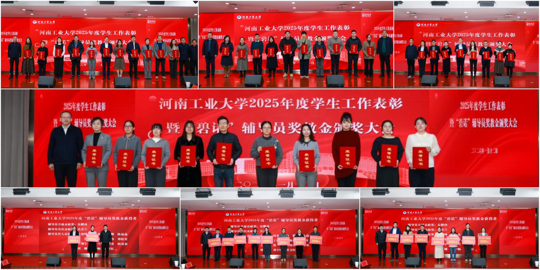 与会领导首先对第二届全国大学生职业规划大赛优秀指导教师、2025年度河南省高等学校军事理论优质课获奖教师、优秀辅导员、优秀班主任、征兵工作先进个人,资助优秀工作者、优秀心理咨询师、心理育人教师优秀工作者、就业先进个人、美育之星、志愿之星、科创之星、实践之星、红色传承之星代表颁奖,为征兵工作突出单位、国防教育先进单位、心理育人工作先进单位、资助工作先进单位、学生安全稳定工作优秀单位代表,就业工作示范学院、考研工作先进单位,中国国际大学生创新大赛先进单位、团委工作先进单位、“挑战杯”工作先进单位、社会实践工作先进单位、学生工作先进单位等获奖代表颁奖。优秀校友、广州碧诺生物科技有限公司销售经理李龙乾为岳鹏珍、吴若旻等“碧诺”辅导员卓越贡献奖教金、突出贡献奖教金、育人贡献奖教金获奖代表颁奖。